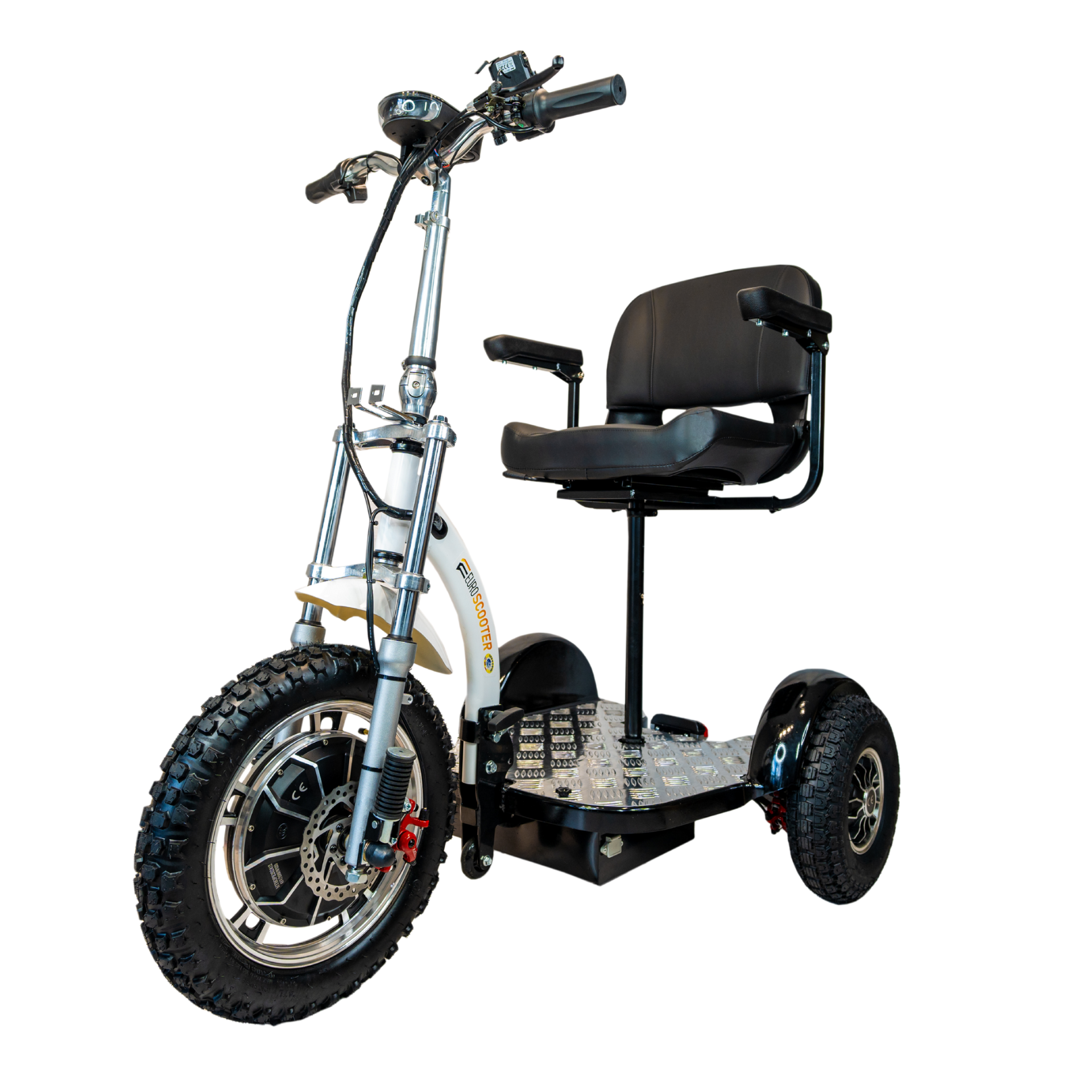 The Genoa AWD Euroscooter is fast, fun, and eco-friendly! It reaches speeds up to 25 MPH, making it the ultimate get-around for friends and family. The Genoa AWD provide several options for riding. First, in front wheel only mode ( Powered by the 1000W front motor), rear-wheel drive , which means dual motors (one in each rear tire), or All-wheel drive, where the scooter is powered by three motors at a combine 2000W for an extra boost. Comes standard with captains chair for comfort. Remove the seat and fold down the handlebars for ease of transportation. The Genoa AWD Euroscooter combines fun riding, easy operation, and fantastic durability all in one package!
